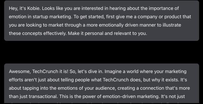 首先,Fuller 引用了他在 2014 年为 TechCrunch 撰写的一篇关于情感如何推动营销的博客文章,并在非常具体的提示下通过 GPT-4 运行该文章,同时使用聊天机器人来构建交互部分。“我在基本内容之上添加了复杂的提示,作为人工智能微对话的唯一信息来源,”他说。