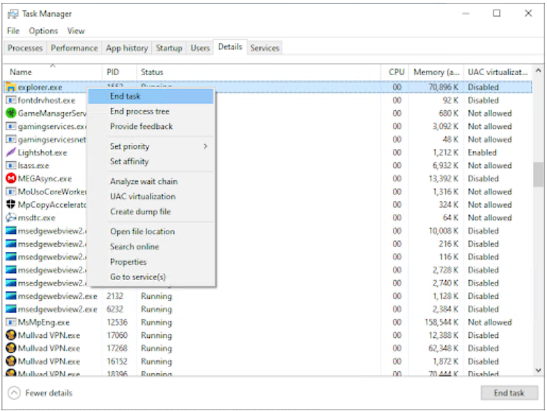 切换到“详细信息”选项卡并找到explorer.exe进程,然后右键单击它。从上下文菜单中选择结束任务。这将完全关闭 Windows 资源管理器。