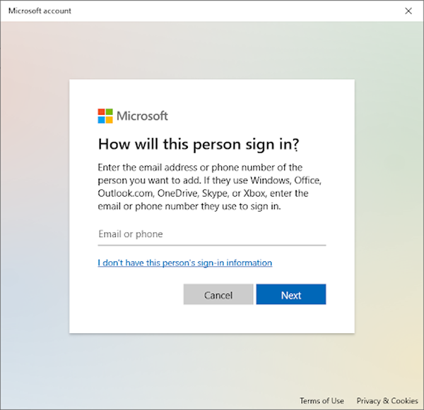 接下来,单击添加没有 Microsoft 帐户的用户链接。