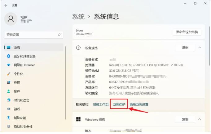 1、 打开【设置】-【系统】-【系统信息】,找到【系统保护】,点击进入;